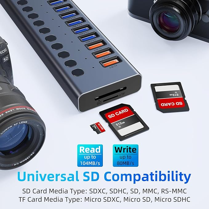 - 17 IN 1 Powered USB 3.2 Hub: VANGREE Powered USB Hub equips with 10 x USB-A 3.2 ports, 3 x USB-A QC3.0 (24W) fast charging ports, 2 x USB-C 3.2 ports, SD/TF card reader. Note: 3 fast charging ports do not support data transmission.
