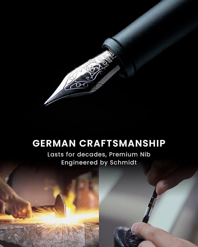 - ✅ Addictivve & Silky Writing Experience: Your creativity needs to flow uninterrupted. This 2-In-1 Set comes with extra rollerball pen grip. Schmidt rollerball cartridge, and stainless steel fountain pen nib from Schmidt, the Germany company with over a century of experience in craftmanship excellence. Thanks to their exquisite inflow design, pure, unbroken lines of thought jump forth from the pen to paper without spills, spotting, or explosions.
