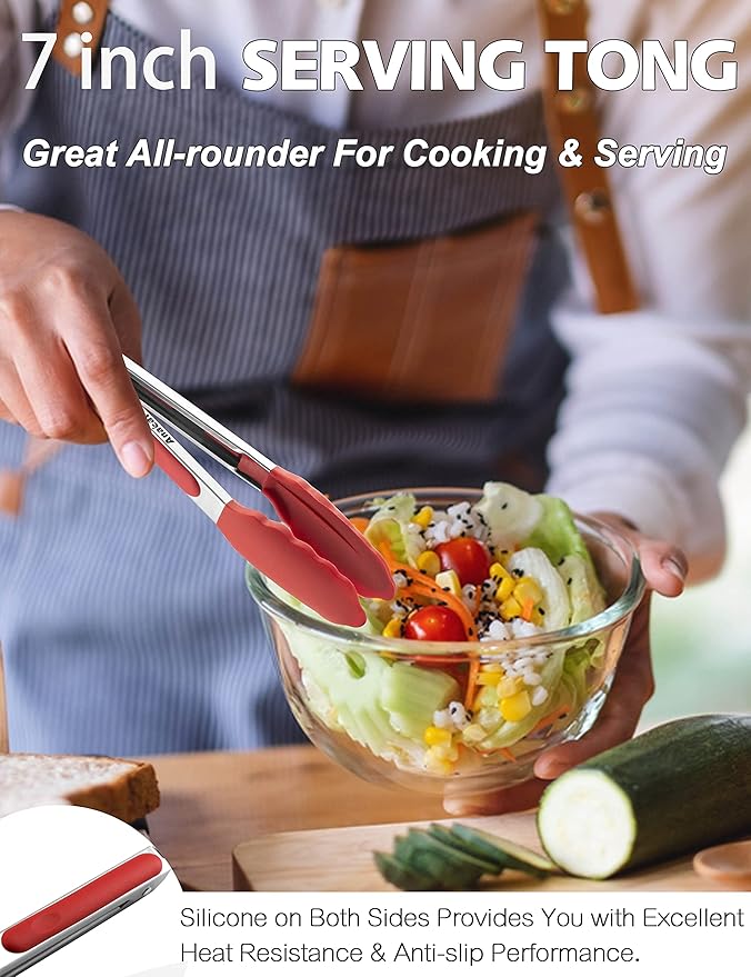Anaeat Non-Stick Silicone Locking Tong Set of 3 - Stainless Steel 7", 9" and 12" Kitchen Food Tongs with Non-Slip Silicone Tips and Grip for Cooking, Baking and BBQ - Heat Resistant up to 480°F (Red)