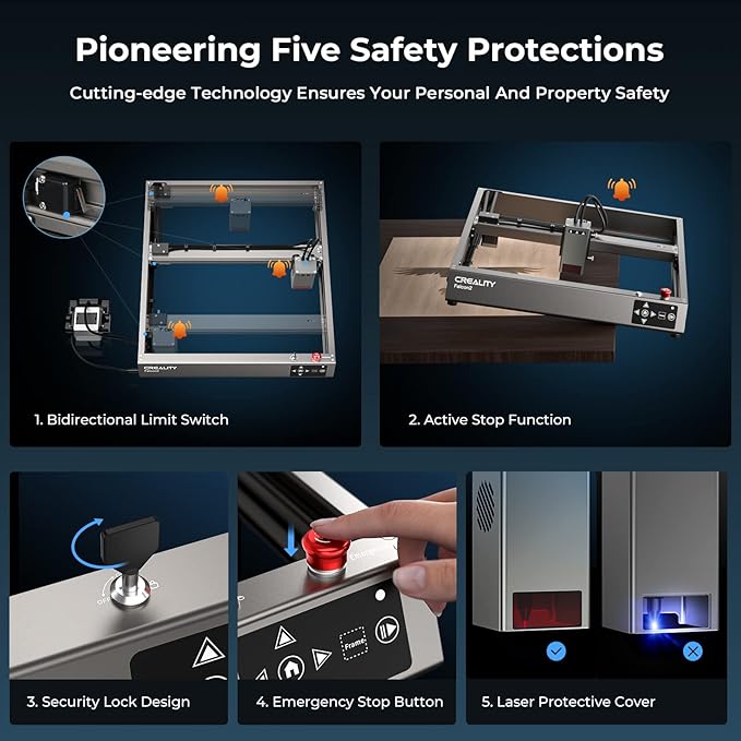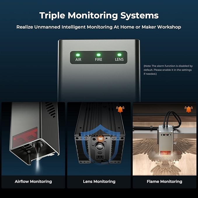 - Triple Intelligent Monitoring System - The Creality falcon 2 laser engraver has a triple intelligent monitoring system that includes airflow, flame, and lens monitoring. It reminds the user of the airflow size and stops the machine immediately if a flame is detected. The lens monitoring system triggers an alarm when the lens is dirty