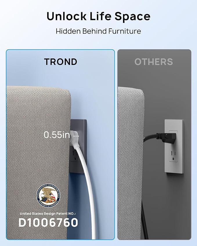 - 15ft extension cord flat plug - Made of 14awg pure copper, the 15-foot long power cord is heavy-duty and has better current carrying capacity (15a). The low-profile space-saving 45° angled flat plug doesn’t block the bottom receptacle