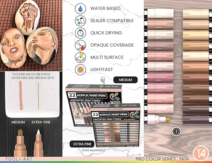 TOOLI-ART 22 Acrylic Paint Markers Paint Pens Pro Color Series Set 3mm Medium Tip for Rock Painting, Glass, Mugs, Wood, Metal, Glass Paint, Canvas, DIY. Non Toxic, Waterbased, Quick Drying (SKIN)