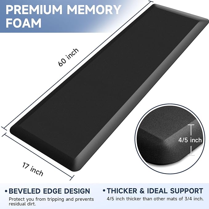 4/5 Inch Thick Kitchen Mat Anti Fatigue Mat Kitchen Rugs Kitchen Decor Non-Slip, Stain Resistant, Waterproof Kitchen Mats Desk Mat for Kitchen, Office, Workshop, Black, 17'' x 60''