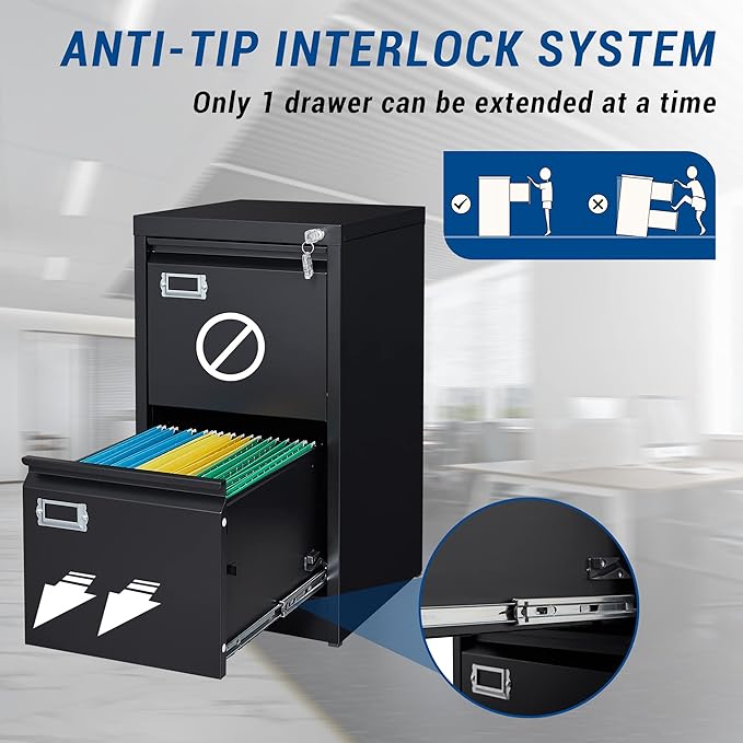 - LOCKABLE 2 DRAWERS FILE CABINET - All the file drawers can be locked by one lock, It is very convenient to control the whole filing cabinet with one key.