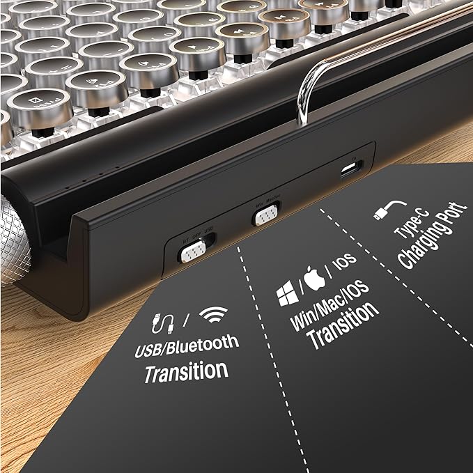 - Double-Modes Connectivity: Offering versatile connectivity, the retro mechanical keyboard can be connected via USB-C or Bluetooth to three different devices. allowing you to switch between your tablet, laptop, and phone. Compatible with Windows / macOS / android. This makes it the perfect pick, not just for gamers, but also for professionals who require seamless connectivity with multiple devices