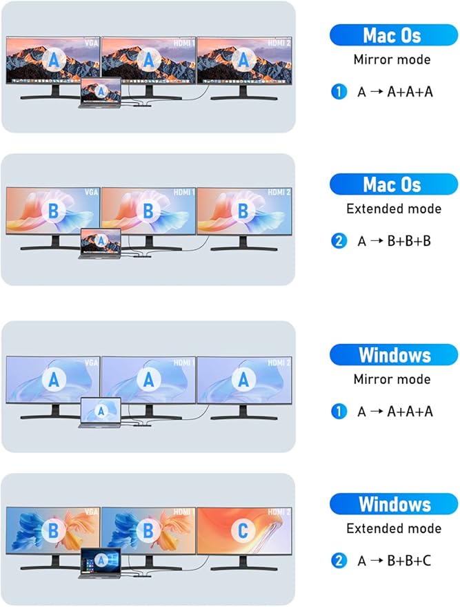 - 【Docking Station Dual Monitor 2 HDMI&VGA】This usb c dock will help you to easily achieve dual&triple monitor display,meets all your needs and make your work easier;Single use HDMI 1 can up to 4K 30Hz under DP1.4 source; And resolution support up to 4K@30Hz & 2K@60Hz when simultaneously connect dual hdmi;And resolution support up to 1080P for external 3 monitors when triply display under DP1.4 source;Notices:MacOs laptop only support SST mode, so all external monitor screens will be the same.