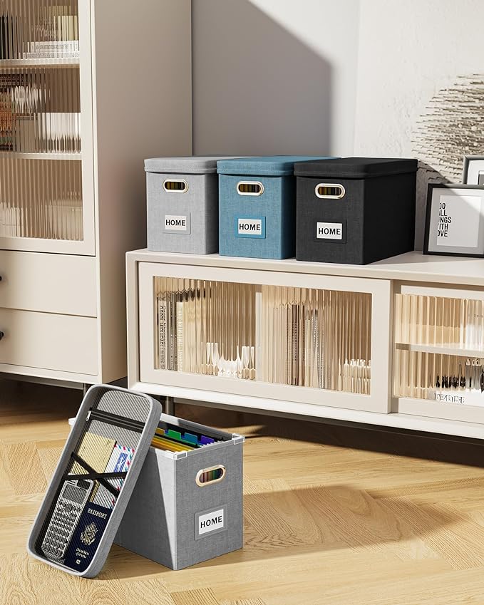 - 【Extra Mesh Bag on Lid】Grey letter size file organizer box has an extra mesh pocket on lid which can store little things such as pens, invoices, papers, scissors,etc. With more storage space design, more efficient storage of documents and items.