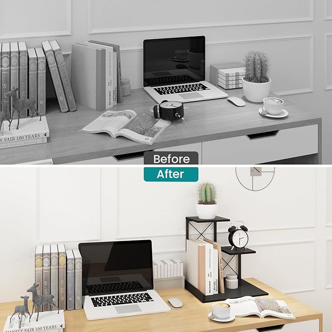 - Versatile Storage Solution: With three tiers of storage space, the desk bookshelf offers ample room to accommodate a variety of items. The size of desk shelf is 9.25"D x 11.8"W x 11.4"H, store books, photos, office supplies, decorations, plants and more, keeping your essentials within easy reach and reducing clutter.