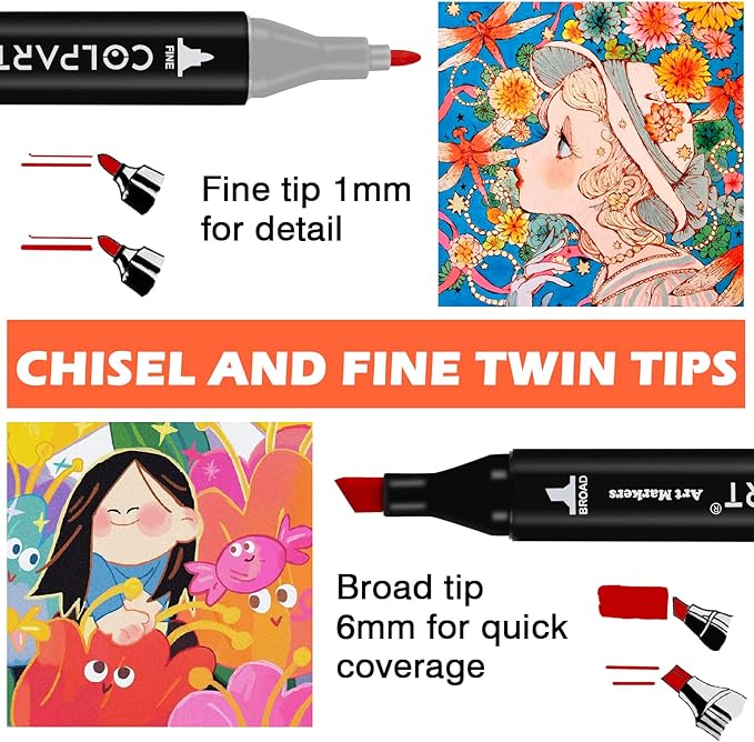 - 【Dual Tips Alcohol Markers】Dual Tips Art Markers Design allows you to make thick and thin lines without changing markers.Includes Fine tip 1mm and Broad tip 6mm twin tips for precise highlighting, sketching and underlining. Thin markers can be used to write and hook line while thick art markers professional are suitable for drawing and coloring book.