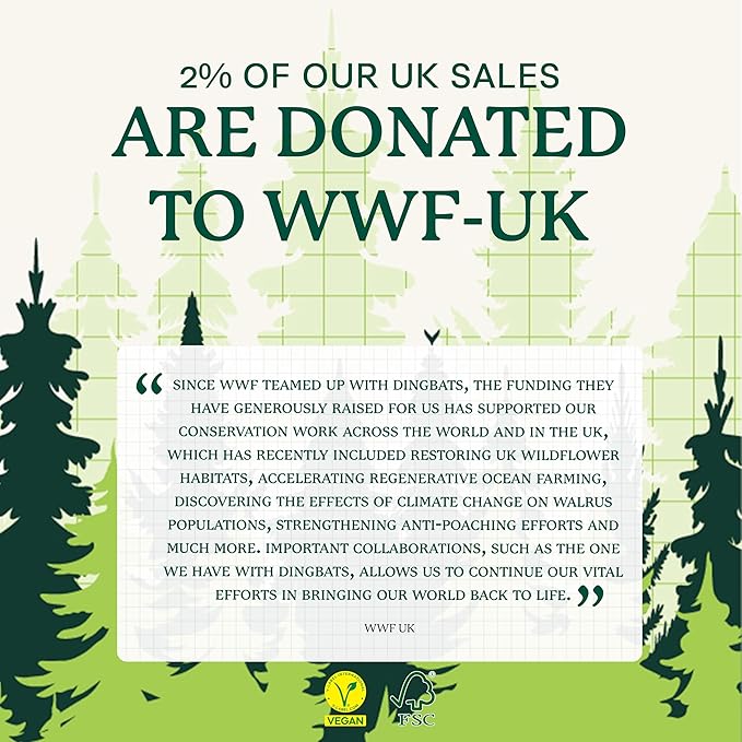 - SUSTAINABLY SOURCED, ENVIRONMENTALLY CONSCIOUS: Join us in our commitment to sustainability. Crafted from recyclable materials and FSC certified paper, our notebooks are a sustainable option and proudly Vegan Certified. Additionally, for its UK sales, Dingbats* Notebooks Ltd donates 2% of its revenue to WWF-UK, a charity registered in England and Wales (1081247).