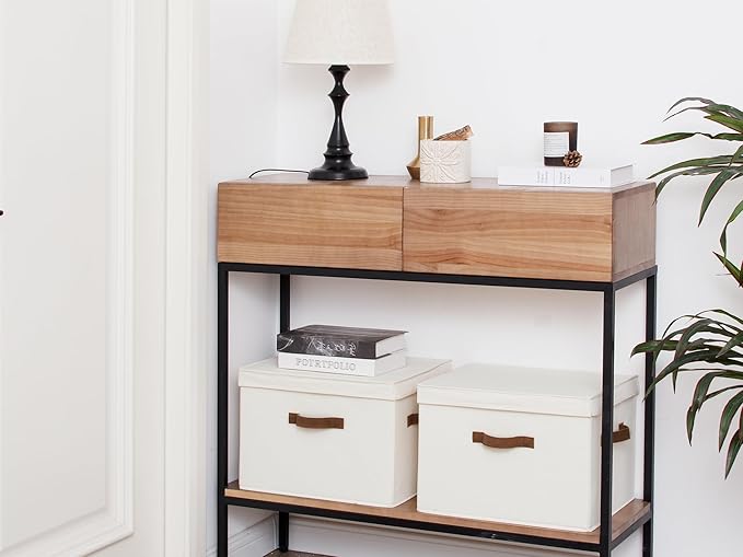 StorageWorks Fabric Storage Bins with Lid, Decorative Storage Boxes for Shelves, Stackable Closet Organizer Basket with Handles, Large, Ivory White, 2-Pack