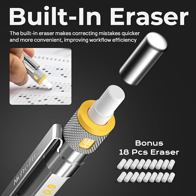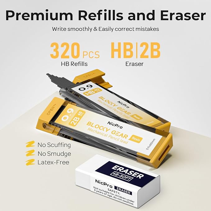 - Nicpro Blocky Gear:Come with 3pcs metal 0.9 mm mechanical pencil and 8 tube of 0.9 mm lead refills(HB,2B) ,40pcs / tube,3pcs 4B latex-free eraser,18pcs replaceable cap erasers,all the stuff storage neatly in a case with flocking tray,what a gift for friends & family!