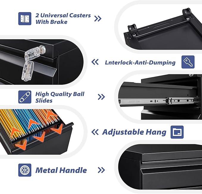 - 【Interlocking System】:The anti-tilt device allows only one drawer to be opened at a time, preventing the filing cabinet from tipping forward. Furthermore, our under desk filing cabinet is equipped with a central lock, which can secure all drawers with just one key, adding an extra layer of security to your home or office.
