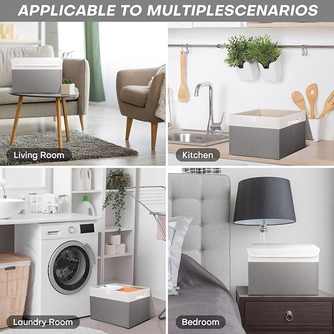 - 【Premium Quality】 -These fabric storage bins with lids are made of durable and breathable linen fabric with the high quality cardboard on the sides and bottom. The fabric is eco-friendly and durable, with no odor. The inner 2.2mm thick cardboard maintains fabric storage box shape and structural integrity. Both handles are sewn through cardboard to make this decorative storage boxes rigid enough to hold a heavy load.