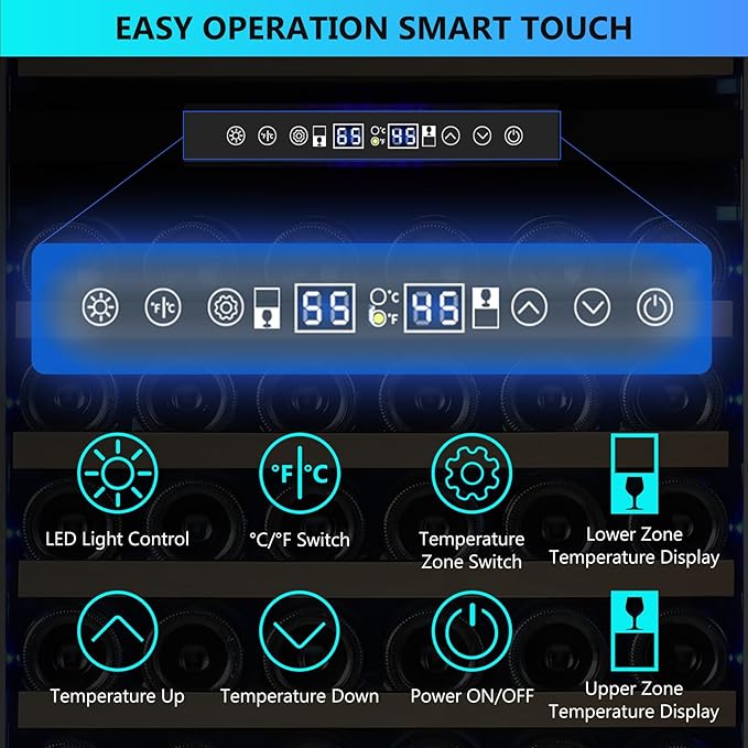 - 【Advanced Compressor Cooling and Circulation System】The ORYMUSE large dual-zone wine refrigerator employs cutting-edge compressor technology and a robust circulating fan, delivering rapid, powerful, and stable cooling. The internal upper and lower zone air circulation system ensures even distribution, allowing you to store different wines according to specific temperature range needs. Adjustable temperature range for the upper zone: 40-55°F (5-13°C), lower zone: 55-65°F (13-18°C).