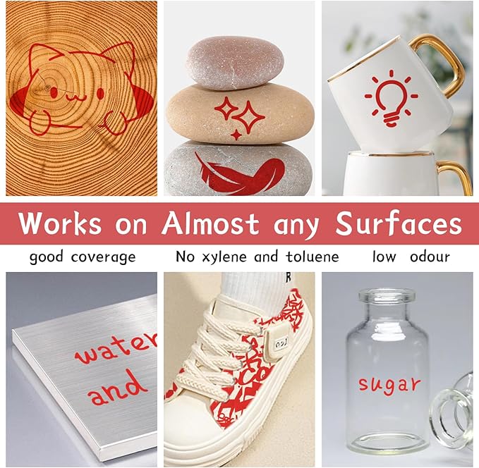 - Red Paint Markers: Red paint pens are made up of a long-lasting oil-based opaque ink, Low odor. The ink resists fading, water and abrasions, designed to stand out on both light and dark surfaces. Paint markers can be used on glass and once dry they will be permanent and waterproof