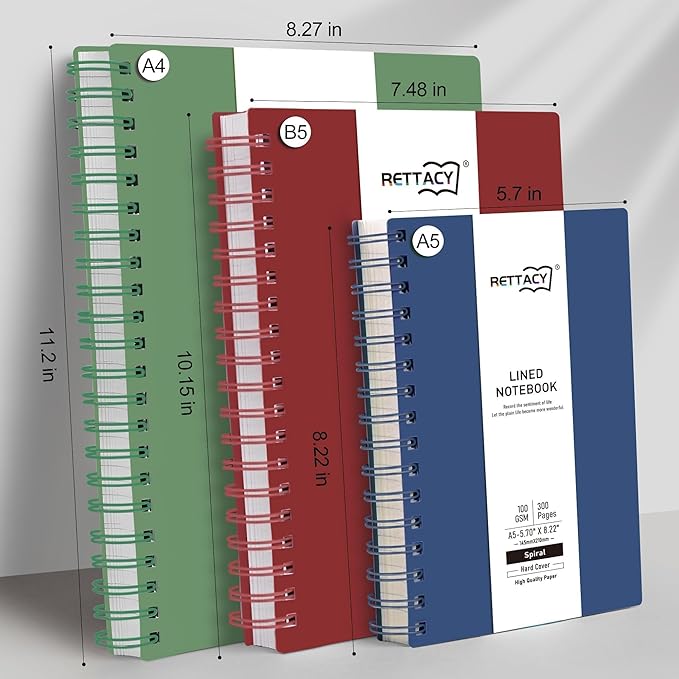 - COLLEGE RULED NOTEBOOK: RETTACY College Ruled Notebook comes in a A4 (8.27'' × 11.2'') size, 150 Sheets/300 Pages, Sturdy Twin-wire Spiral Bound, 7 mm college ruled writing space, 100 GSM Acid-free Paper, Sticky Notes