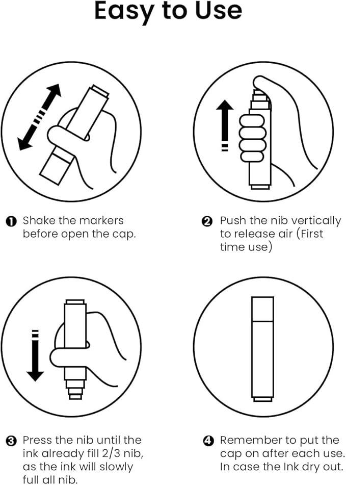 - Instruction: For the acrylic paint markers please shake the marker before use, and press the nib up and down or several times until jumbo marker tip fills with ink(first time use). Please cover the cap after use, in case the Ink dries out.