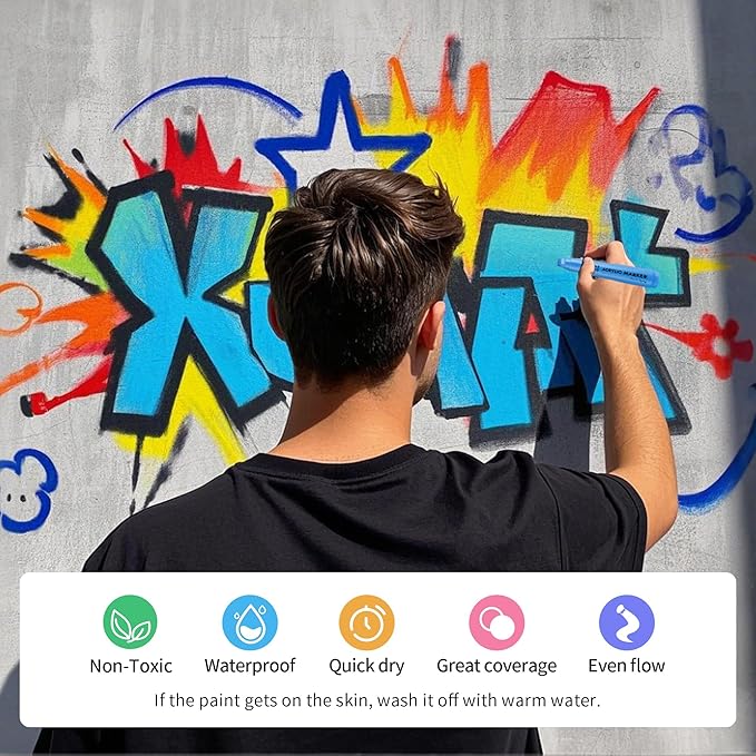 - Acrylic Graffiti Markers: BIGTHUMB Jumbo Poster Markers is made with the highest-quality non-toxic, acid-free,no odor, no-leakage water-based acrylic ink that is waterproof, quick dry, long-lasting, and has a smooth ink flow. Each permanent painting marker conforms to ASTM d-4236 and EN-71 safety standards.