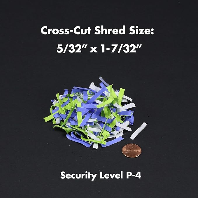 - Shreds paper, CDs, DVDs, credit cards into small pieces (5/32 by 1-7/32 inches), security level P-4