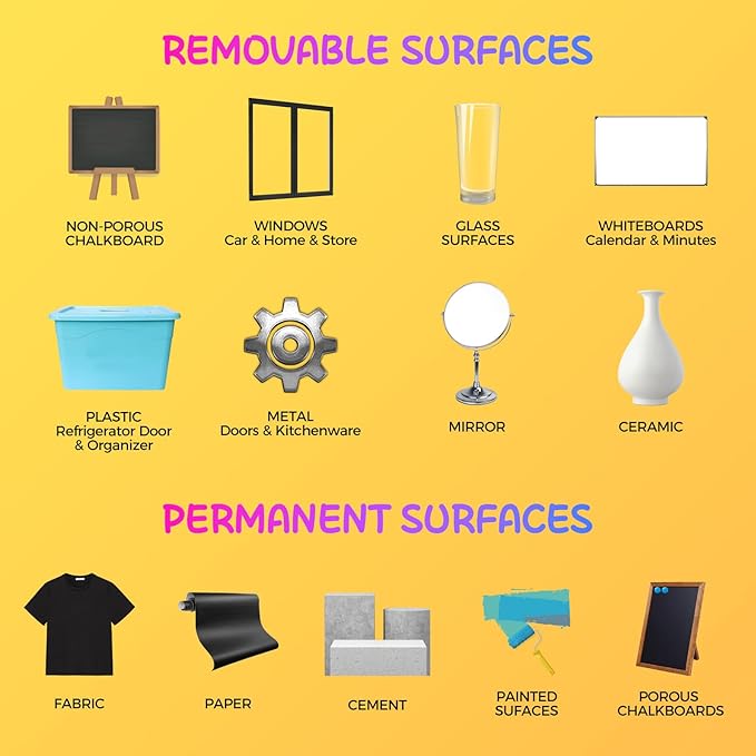- VERSATILE: These chalkboard markers are suitable for writing on any primed chalkboard, glass or other non-porous surface, including glass, tile, contact paper, stickers, LED boards, whiteboard, plastic and metal. It also makes great window markers and dry erase markers. Whether you are in school, office, cafe, restaurant, liquid chalk markers are your best choice.
