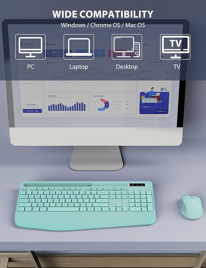 - BUILT FOR COMFORT - Ergonomic keyboard designed with a generous palm rest and tilt legs, offers a better typing position to reduce the pressure on your wrist. The wireless mouse provides total comfort with a perfect handshake angle, contoured grips and premium matte finish.