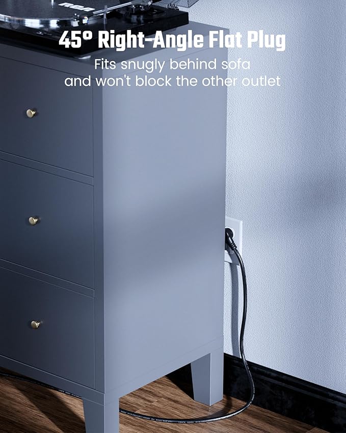 - 【10FT Flat Plug Cord & Mountable】 With 4 T-shape mounting holes on the back, and the included 4 screws and 1 drill template, you can easily mount the flat plug extension cord with multiple outlets horizontally or vertically on walls, behind the TV, or under the desk, leaving you a clutter-free working / entertaining environment! At the end of the 10ft 14AWG heavy-duty cord, the space-saving 45° angled flat plug fits snugly behind furniture and won't block the other outlet.
