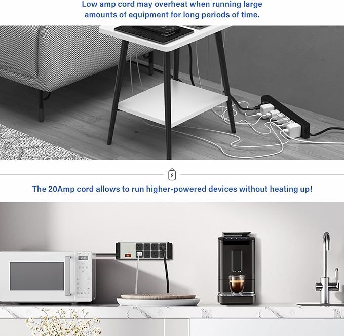 - 12 gauge 6ft heavy cord, rating: AC 20A 125V 2500w. If you are running a lot of equipment for long periods of time or fully loaded 15A equipment, and without overheating.
