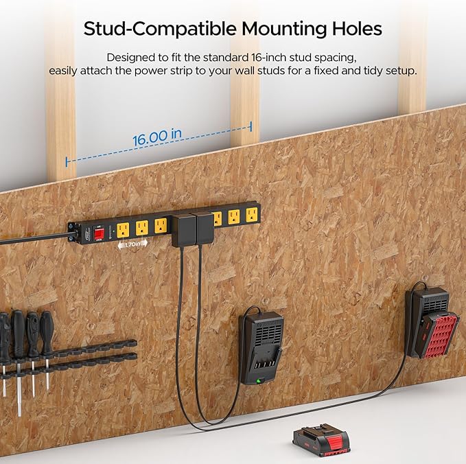 - [Humanized Design] This long power strip is designed to fit the standard 16-inch stud spacing, allowing you to easily attach it to your wall studs for a secure and organized setup. Wide-spaced 1.7-inch center-to-center outlet, perfect for bulky plugs and power supplies. 45Β° angled flat plug, and mounting supported hanging slots, all these features bring you more convenience