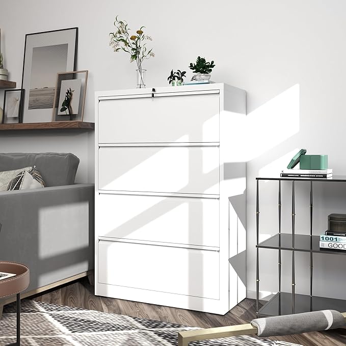 - 【Sturdy and Functional】 The 4 drawer file cabinet size:D15.75"*W35.43"*H28.5", drawer size:D13.98"*W32.44"*H9.8", each drawer can support up to 55 lbs. The lateral file cabinet is equipped with premium full-extension metal drawer slides, allowing for smooth and easy access even when fully loaded, making organization a breeze.