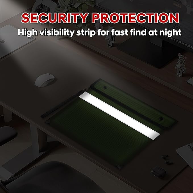 - ☔【Unique Design】This fireproof bag is not only functional but also stylish. It has a unique double-sided reflective strip that allows you to clearly see its position in the dark no matter how you place it. Its zipper is a treated waterproof zipper,combined with flip closure design, so that the fireproof bag can protect your documents under high-pressure water cannon, but note that it is not waterproof when submerged underwater.