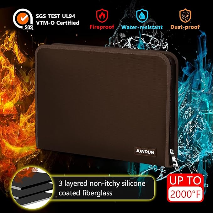 - HIGH-QUALITY MATERIALS: Protect your documents with our fireproof accordion file organizer.Made of double-layered,non-itchy,silicone-coated fiberglass,it can withstand up to 2000℉ and has passed the SGS Test (UL94 VTM-0 Certified). Highly water-resistant,it's the perfect solution for unexpected spills or accidents.Keep your files organized and easily accessible with our expanding file organizer.Invest in added protection today!
