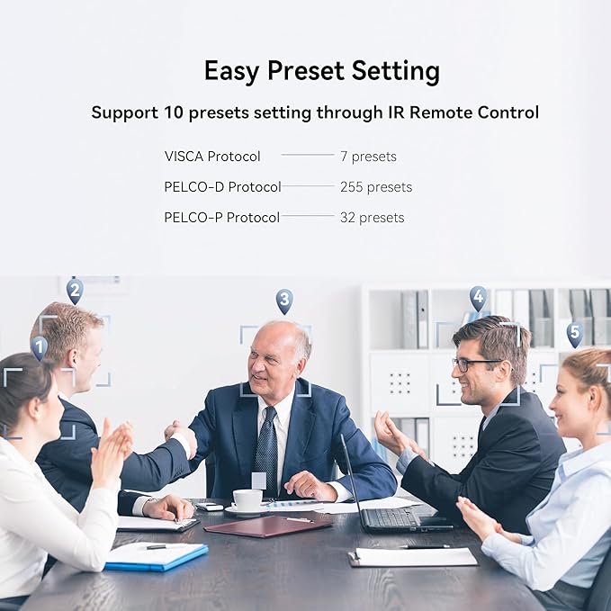 - 🌟【𝐒𝐦𝐨𝐨𝐭𝐡 𝐚𝐧𝐝 𝐒𝐢𝐥𝐞𝐧𝐭 𝐏𝐚𝐧/𝐓𝐢𝐥𝐭 𝐌𝐨𝐯𝐞𝐦𝐞𝐧𝐭】Tenveo PTZ Conference Camera can be controlled remotely to rotate 350° (±175°) horizontally and 180°(±90°) vertically in an accurate, smooth and silent way. It is also supportive of 10 presets setting through the IR Remote Control and is available to set up to 255 presets via RS232 and RS485 interfaces for professional control. The convenient way could quickly control the PTZ camera pan, tilt, zoom, and move to the preset position for close-up sequence.
