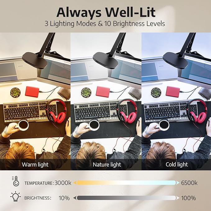 - Personalized Lighting for Every Moment: Experience ultimate flexibility with desk webcam light's 3 adjustable color temperatures (3000K-6500K) and 10 brightness levels, plus stepless dimming for the perfect ambiance. Whether you're painting, writing, or live streaming, the high CRI (>95) ensures true-to-life colors, enhancing your attention to detail. Day or night, tailor your lighting to boost productivity and creativity.