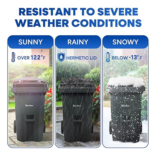 - Durable HDPE Construction: Made from high-density plastic, this plastic trash can with lid on wheels is built to withstand heavy use and harsh outdoor conditions for long-lasting performance.