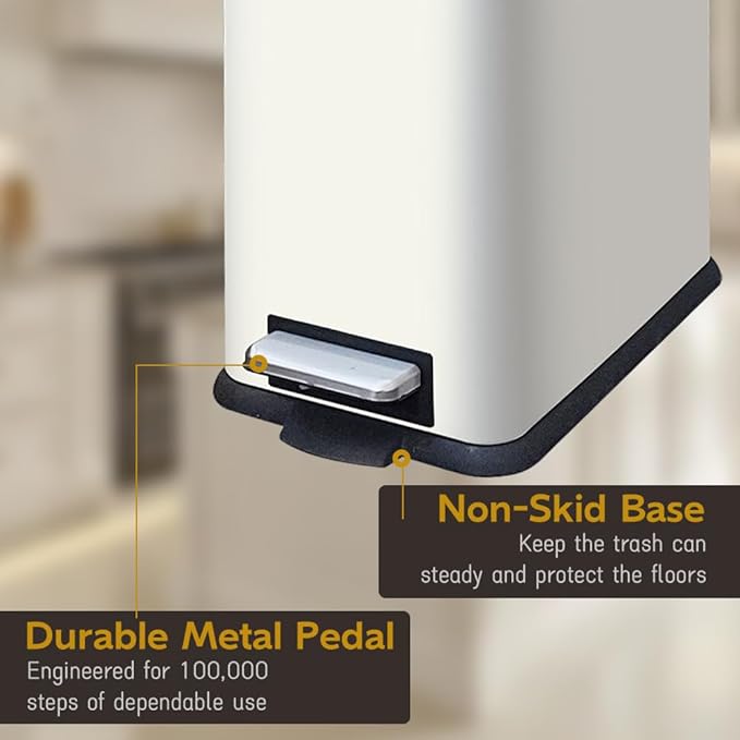 - Stable & Anti-Slip: Non-skid base keep your whtie garbage can firmly grounded, no matter the floor. And the strong steel pedal is engineered to last over 100,000 steps.