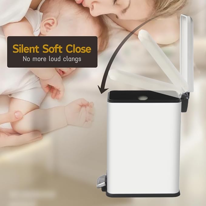 - Soft Close & Stay Open Lid: Equipped with a soft-close mechanism and a stay-open feature, white bathroom garbage doesn't slam down and make noise.