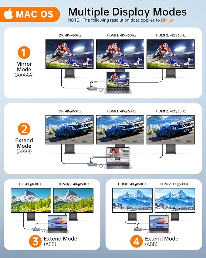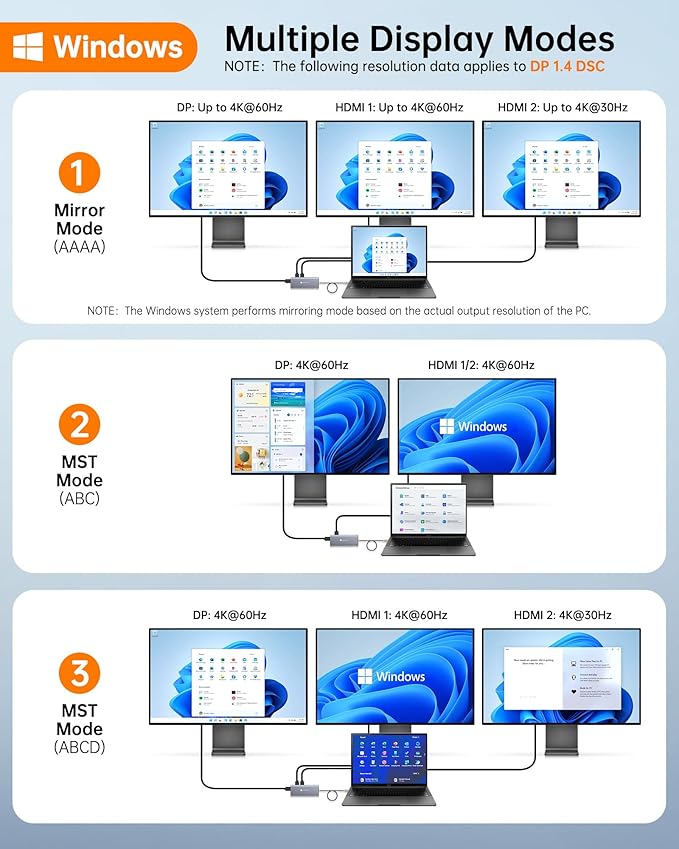 - 📈【Triple Display Made Easy】Perform multitasking work with MST(A-BCD) support. In Windows system, this USB-Hub allows you to display different content on triple 4K@30Hz monitors and easily manage complex projects with spreadsheets, documents and presentations across screens. 🔺Note: macOS only supports mirroring or single extension (A-AAA or A-BBB), not MST multi-monitor support.