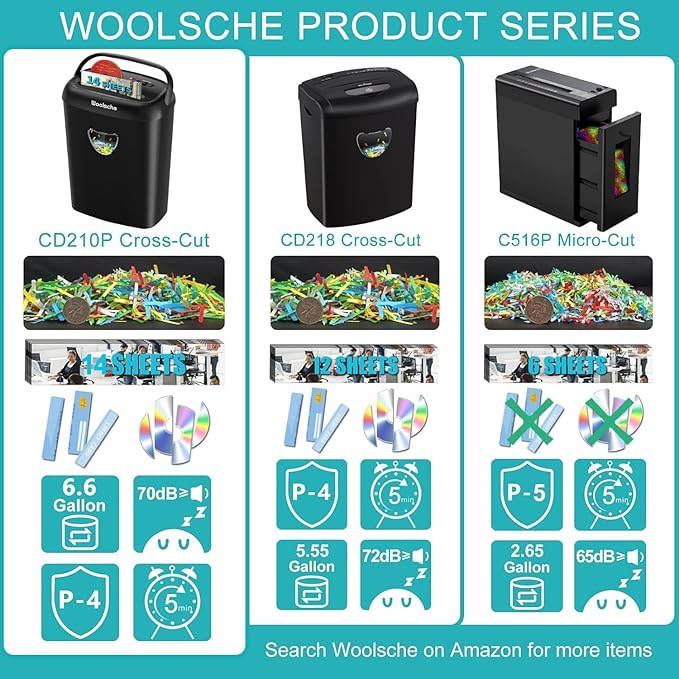 - 【P-4 High Security Level】Woolsche crosscut paper shredder for office,shred max 14-sheet paper at a time,cut paper into 5/32" x 1-13/32"(4x35mm), no need to remove staples or clips.