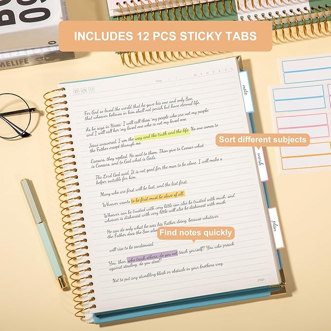 - Upgraded Lined Journal Notebook: Note book comes with 12 pcs colored tab stickers. You can create sections to organize multi subject and quickly locate desired parts. With an elastic closure band, keep the covers closed and secure when not in use, also great for keeping your place as bookmark. The back cover includes a pocket for cards and note-taking notes