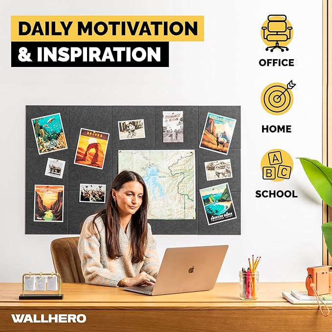 - 💡 𝐈𝐍𝐒𝐏𝐈𝐑𝐀𝐓𝐈𝐎𝐍 𝐀𝐓 𝐀 𝐆𝐋𝐀𝐍𝐂𝐄: Use these felt tiles as your personal vision board to keep your goals in sight. Whether for career, health, photos, or personal projects, WallHero empowers you to plan, execute, and achieve.