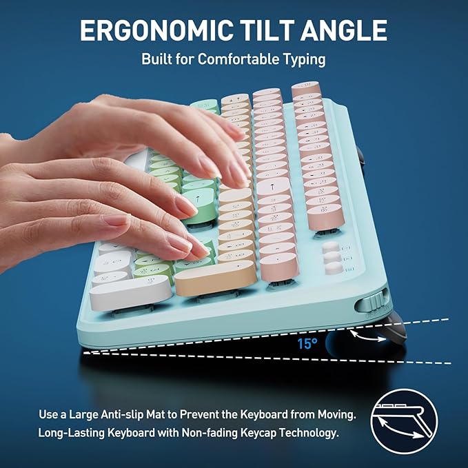 - 【 Wireless Keyboard Mouse Combo】The inspiration for these cute rounded keys comes from vintage typewriters offering you visual enjoyment and a retro feeling to type. With colorful key caps, make you be distinctive in the office and work full of fun.