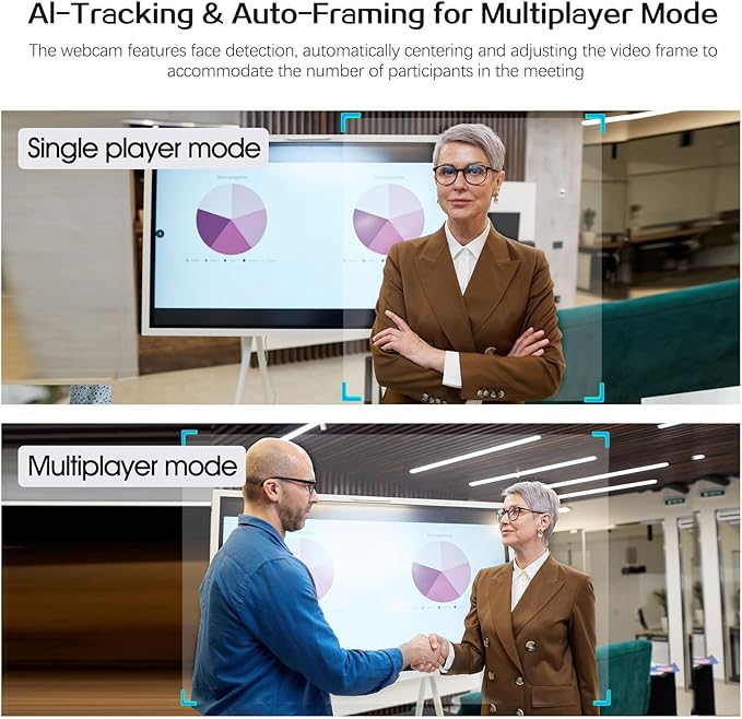 - 【AI-Powered Functionality】Our computer camera's advanced AI streamlines video calls by automatically adjusting the frame based on participant count and intelligently tracking hosts as they move. Easily activated via remote control or touch switch.
