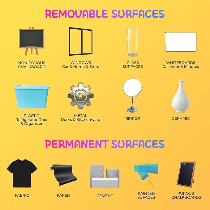 - WIDELY USED: These chalk board marker pens are suitable for writing on any primed chalkboard, whiteboard, glass or other non-porous surface, including tile, contact paper, stickers, LED boards, plastic and metal. Whether you are making weekly planners, writing menus, keeping track of chores, decorating gifts, school activities, writing labels for food storage cans, wet erase markers fine point is your best choice.