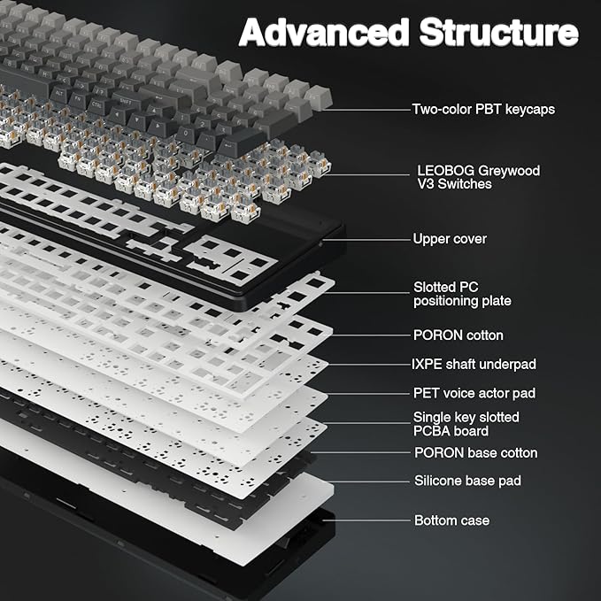 - Advanced Structure and PCB Single Key Slotting: This thocky heavy mechanical keyboard features a advanced structure, extended integrated silicone pad, and PCB single key slotting, better optimizes resilience and stability, making the hand feel softer and more elastic. Five layers of filling silencer fills the gap between the PCB, the positioning plate and the shaft,effectively counteracting the cavity noise sound of the shaft hitting the positioning plate, and providing a solid feel