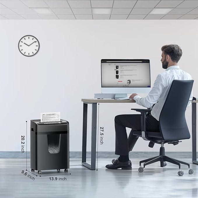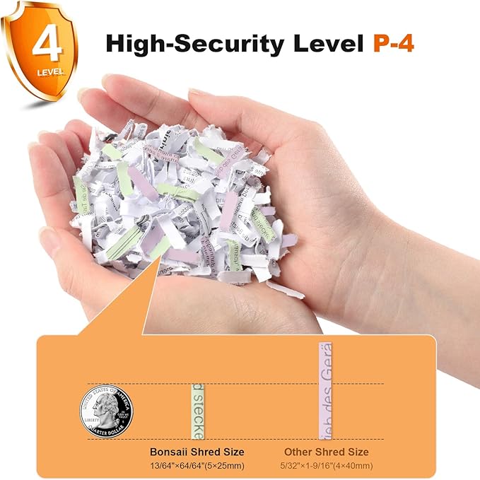 - 12-Sheet Shredder: The home office paper shredder can shred up to 12 sheets(Letter Size, 20lb) at a single pass, shreds paper into tiny particles measuring 13/64 x 63/64 inches (5 x 25mm) and reaches P-4 high-security level; shreds CDs, credit cards and staples as well