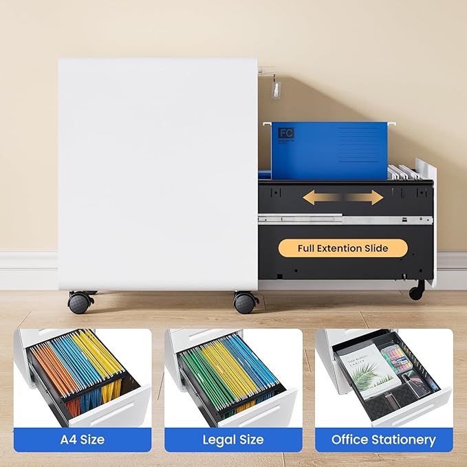 MIIIKO Mobile Filing Cabinet 3 Drawer, White Small File Cabinet with Lock Under Desk, Filing Cabinets for Home Office with Wheels, A4/Letter/Legal Hanging File Folders