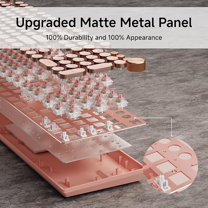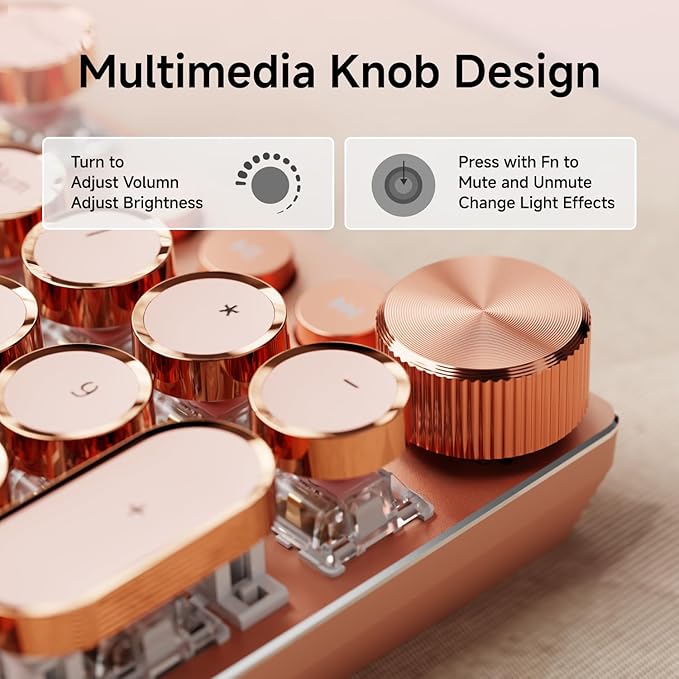 - 【Retro Typewriter Mechanical Keyboard】:The typewriter gaming keyboard has mechanical custom pink switches that feature a smooth linear feeling, and low resistance without a tactile bump feel. round keycaps of the punk mechanical keyboard look like a classical typewriter.keycaps have a matte texture and upgraded touch feel and the sound is quiet when the button is pressed lightly giving you a comfortable typing feeling and a stable click touch.