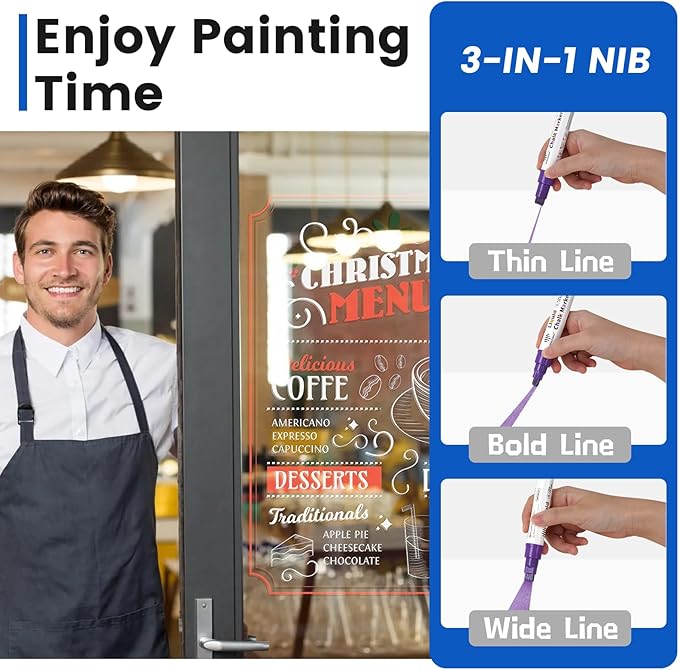 - 10MM 3-IN-1 TIP: The 10mm nib allows allows you to draw fine, bold, and wide lines, making these window markers for glass washable ideal for both detailed and large designs. Effortlessly switch between detailed work on wide strokes on windows and blackboards.