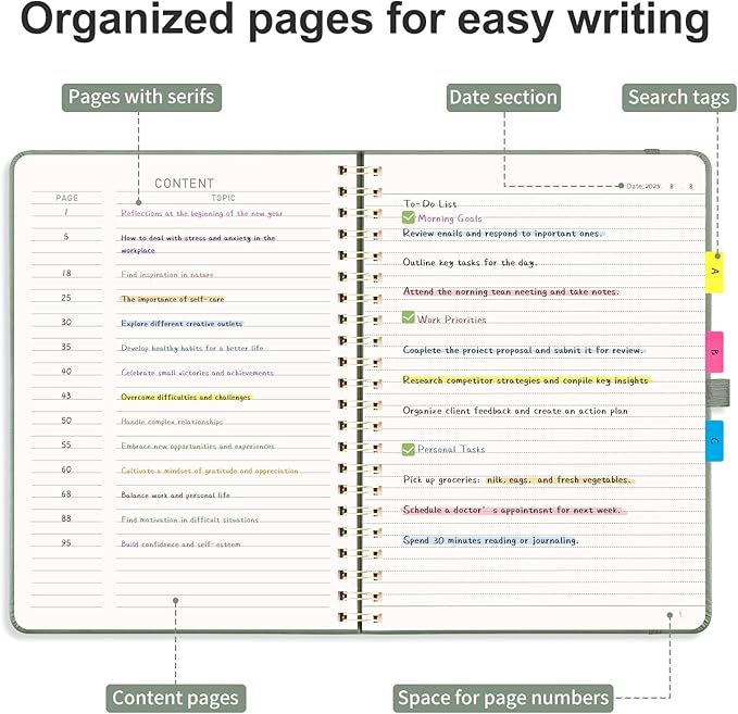 - ORGANIZED AND PRACTICAL NOTEBOOK: Our lined spiral large notebook features 110 numbered pages and 4-page blank table of contents. In a large A4 size 8.5" x 11", providing ample writing space while remaining lightweight and easy to carry